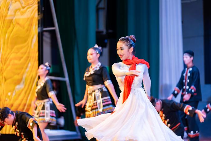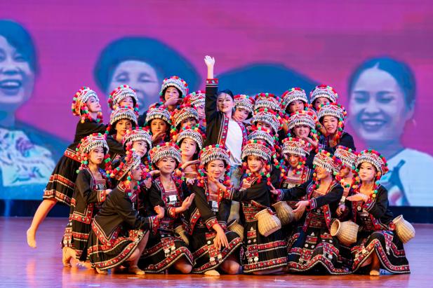 大学生艺术团的哈尼族原创舞蹈《向“春”而行》以我校与乡村振兴结对帮扶点绿春县之间的温暖情谊为背景,讲述绿春籍女大学生返乡支教的真实故事被搬上舞台。哈尼姑娘的柔韧舞步与有力踏步交织,诠释教育帮扶从“输血”到“造血”的温暖,彰显青年投身乡村振兴的担当。