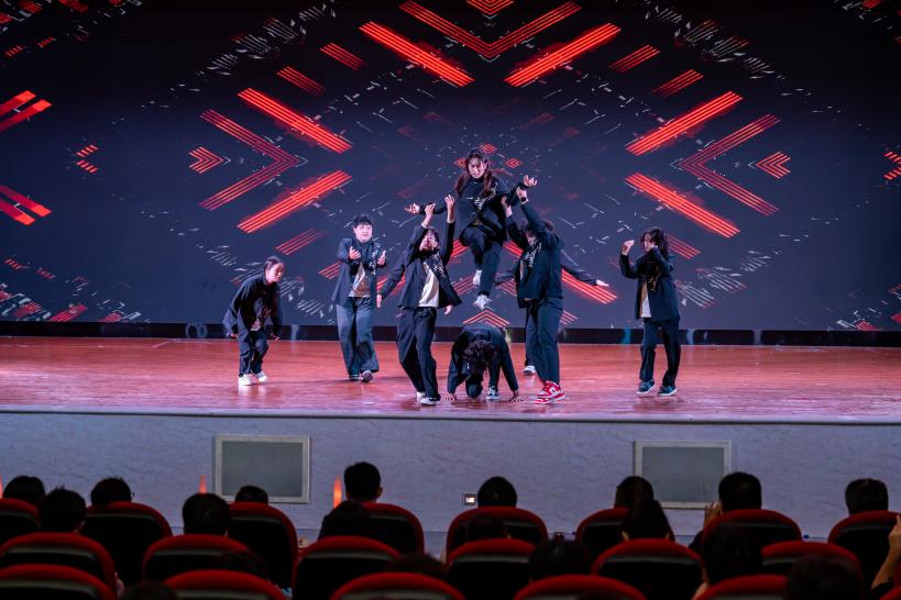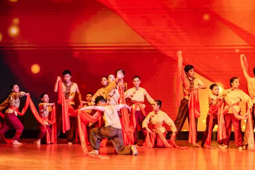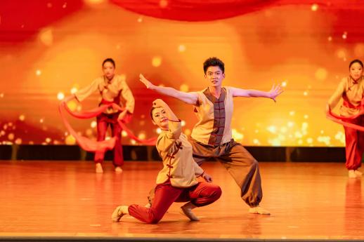 机电工程学院《东方红》群舞激昂,以《黄河协奏曲》的经典旋律回望抗战峥嵘岁月。舞者用铿锵步伐致敬先辈,传递“铭记历史、强国有我”的信念,让红色精神在青春肢体语言中焕发新生。